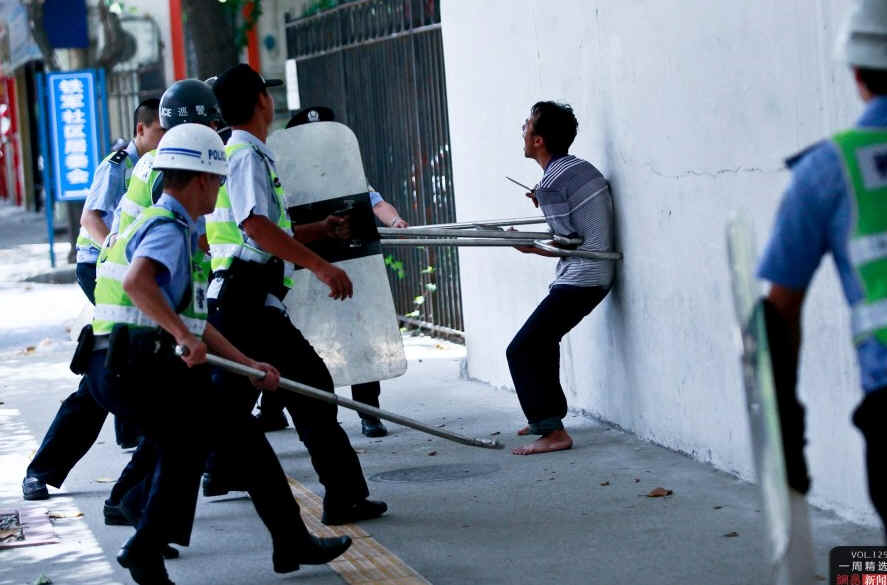 5月24日中午,广东佛山,一位疑似精神病患者上演“刀舞”,持续1个半小时。数十名警察持叉圈,10秒钟将该男子制服。CFP