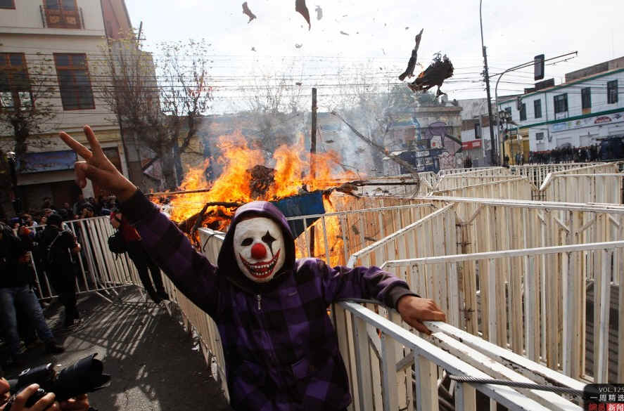 当地时间5月21日,一名抗议者在街头参加反政府游行。当日,智利总统在国会发表了任内第三篇国情咨文,咨文中总结了政府在各方面所取得的成就,提出了一些新的政策措施、计划和法案。REUTERS/ Ivan Alvarado