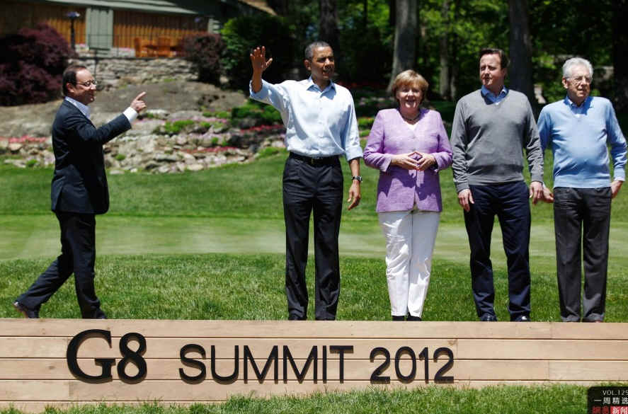 当地时间5月19日,美国马里兰州,八国集团(G8)领导人在马里兰州总统度假地戴维营合影。从左至右依次为法国总统奥朗德、美国总统奥巴马、德国总理默克尔、英国首相卡梅伦、意大利总理蒙蒂。CFP