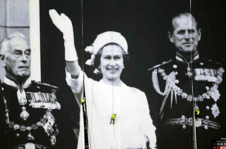 当地时间5月25日,英国泰晤士河旁,为了庆祝英国女王登基六十周年,几位工人在准备一副大型海报,这幅海报长100米宽70米,重达2吨。这张照片拍摄于1977年女王伊丽莎白二世登基25周年庆典。AP Photo/Matt Dunham