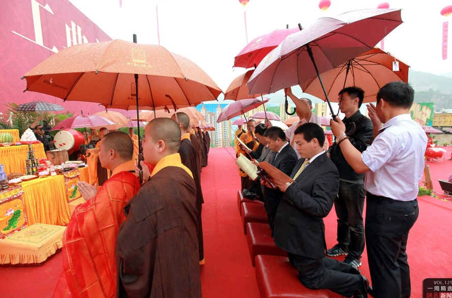 5月24日,浙江省台州市一房产楼盘举行开工典礼。在典礼前,该公司邀请僧人举行开工法会,祈祷工程顺利进行。CFP