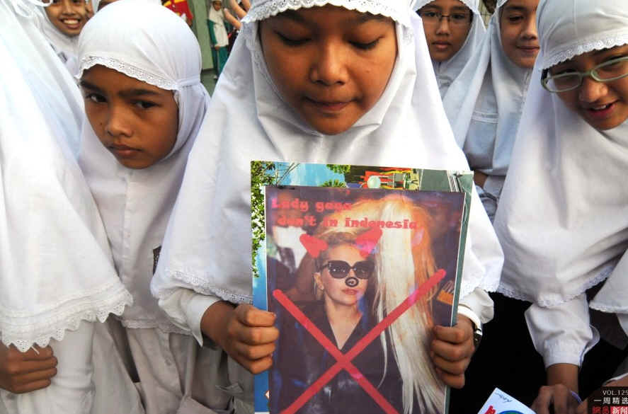 当地时间5月24日,印度尼西亚梭罗,小学生举着反对Lady Gaga演唱会的海报。6月3号,Lady Gaga将在印尼举办的演唱会,其将面临退票的风险。当地一强硬派穆斯林组织伊斯兰抵抗阵线(FPI)的高层对媒体称,“我们将阻止她踏上我们的土地。她最好别把她撒旦般的信仰散布到我们国家。”AP Photo