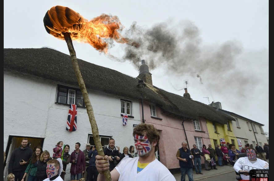 当地时间5月21日,英国西南部城市Hatherleigh,这里是奥运火炬即将经过的城市,正式的火炬传递之前,人们自发组织了山寨“奥运火炬”的传递仪式。REUTERS/Toby Melville