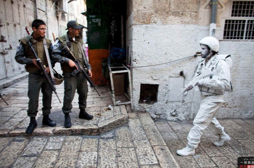 当地时间5月20日,以色列耶路撒冷,艺术家和以色列退伍士兵在街头进行“白士兵”行为艺术演出,纪念以色列的第45个耶路撒冷日。CFP
