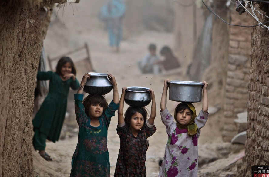 当地时间5月20日,巴基斯坦街头即景,贫民窟里三个女孩运水回家。AP Photo/Muhammed Muheisen
