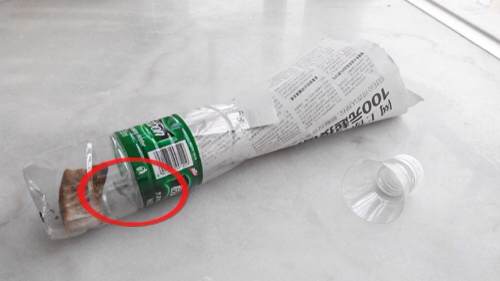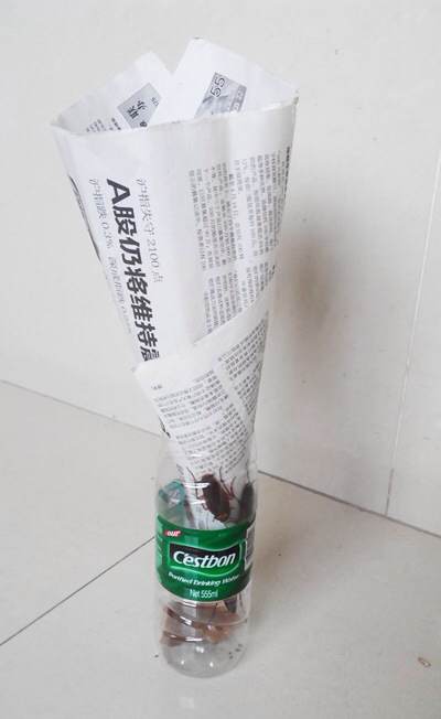 (选矿泉水瓶的时候要选材质硬的,像怡宝、农夫山泉都可以,康师傅纯净水、冰露纯净水的环保瓶太软,瓶口容易变形,报纸塞不紧,蟑螂会从这里爬出来。)