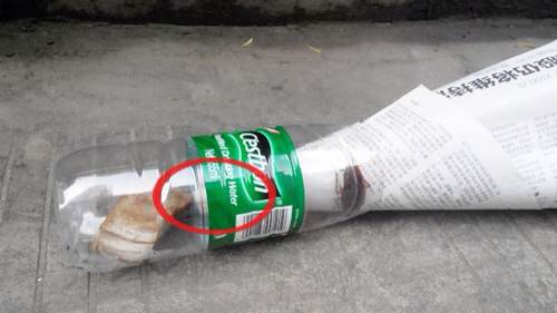 拿去倒的时候,可以竖起来拿,像下面的图一样。可以放一团卷筒纸塞到洞口,这样竖着的时候蟑螂不容易爬上来。一边手拿一个,一次可以拿两个。拿多了,小心瓶口处的报纸缝隙被压到,蟑螂跑出来哦!不然有可能会吓到你半路丢掉瓶子哦!