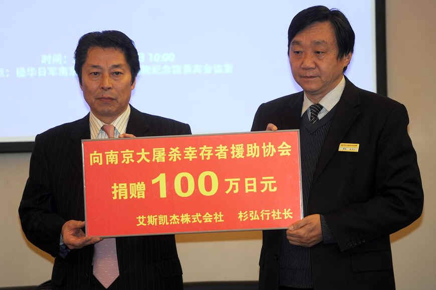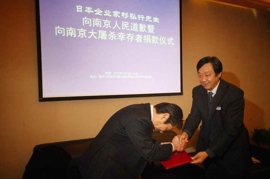 杉弘行(左)向南京大屠杀幸存者援助协会捐款。当日,日本企业家杉弘行向南京大屠杀幸存者援助协会捐款100万日元,并向侵华日军南京大屠杀遇难同胞纪念馆敬献花圈,以此向南京大屠杀幸存者们表示道歉和慰问。