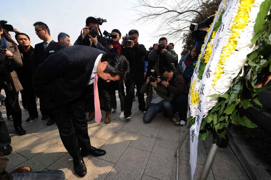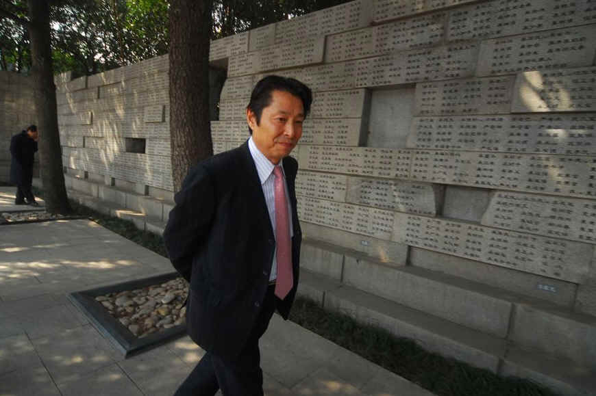 杉弘行在侵华日军南京大屠杀遇难同胞纪念馆遇难者名单墙前鞠躬。