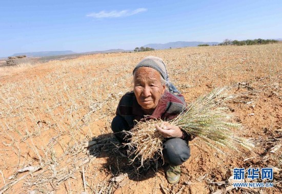 2月9日,云南楚雄彝族自治州永仁县云龙村一名78岁的老人在干枯的麦地里收因干旱所剩无几的麦子。