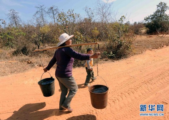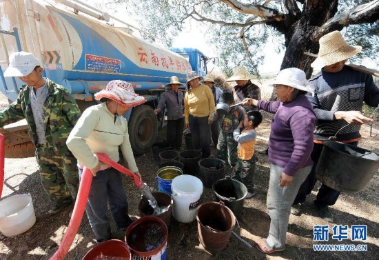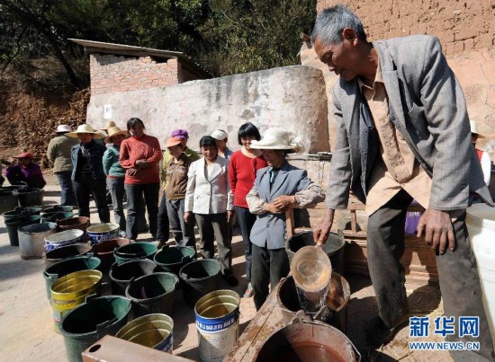 2月9日,云南楚雄彝族自治州永仁县小布租村农民正在接水,当地政府从去年6月开始安排送水车每天为受灾群众送水