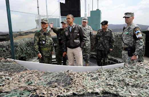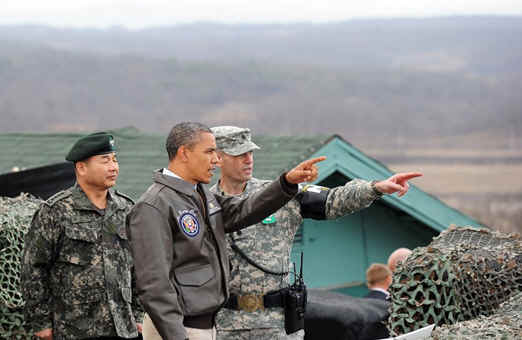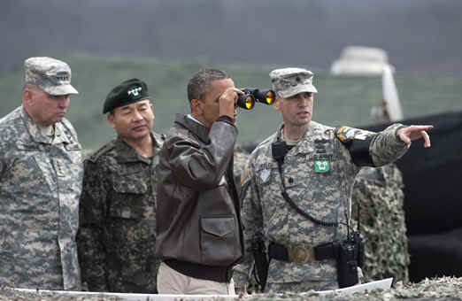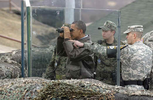 核心提示:3月25日,准备参加首尔核安全峰会的美国总统奥巴马刚抵达韩国,便来到韩朝非军事区(三八线)访问。在这个韩朝两军严密把守的敏感地区,奥巴马拿起望远镜,隔着防弹玻璃,近距离观察朝鲜。