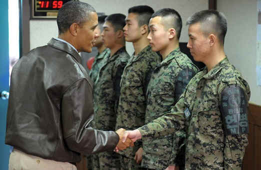 奥巴马到访韩国,是为了参加26日开始的核安全峰会,但他特意将访问韩国的首站,选择在了三八线。当天抵达三八线附近后,奥巴马先来到一处驻韩美军军营,与这里的美军士兵握手并发表简短讲话。