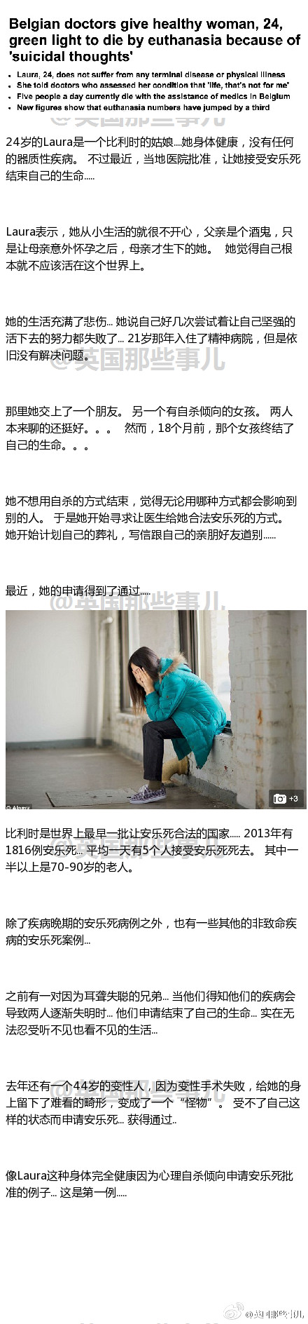 比利时有一个身体健康,没有绝症的姑娘...... 最近她因为长期的心理抑郁申请安乐死...... 医生批准通过了..........