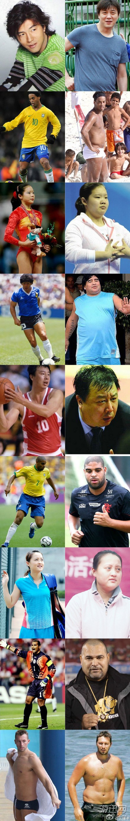 说真的,运动员锻炼强度过大,退役后不会保养,用渐减量的形式锻炼下的话,真的很容易发福。