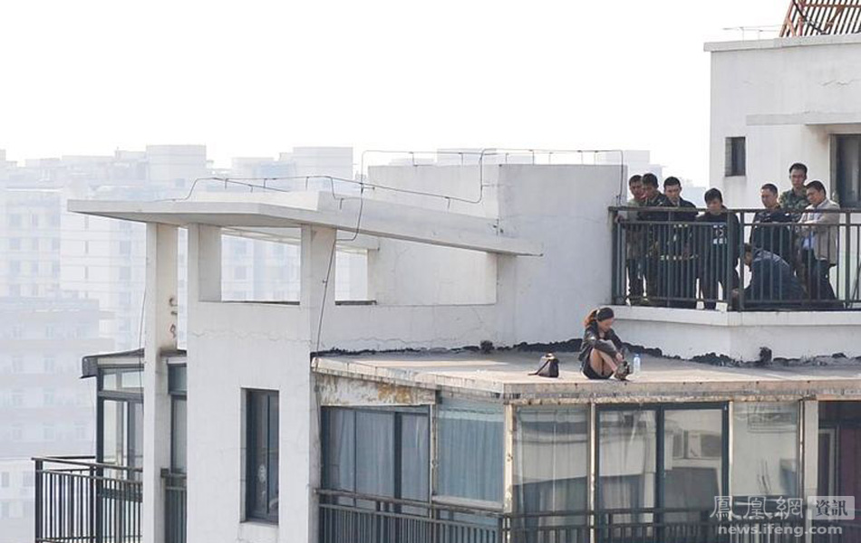 11月12日,江苏省扬州市竹西路扬子佳竹苑8栋,一女子爬上11层楼高的屋顶上欲跳楼。据现场了解,这场闹剧是因婚外情引发——附近的居民称,凌晨2点就听到该女子该小区吵闹,要求一男子与妻子离婚,因为该男子始终没有露面,于是这名女子便爬到楼顶以死威胁。
