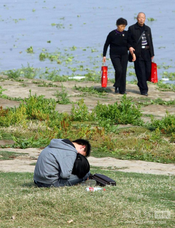 11月12日,湖北武汉阳光灿烂,最高气温达摄氏18度,市民们纷纷抓住“大好日光”,来到汉口江滩尽情享受日光浴。图为一对恋人坐在草坪上旁若无人地热吻。