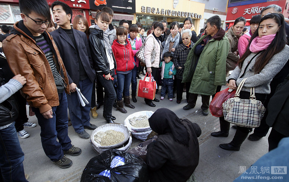 甘肃省兰州市最繁华的路段——西关十字地下通道步行街出口处,一位83岁的老太,靠每天卖麻子和石榴度日,在网络上引发热议。老人是甘谷西街村人,附近一个跟她同村的小贩告诉记者,老人有4个儿子1个女儿,但都不管她。现在老人住在西站,每天早上9时坐车来西关卖麻子,晚上天黑了才回去。记者问及老人姓名和儿女情况时,她只是偷偷抹眼泪。图为因为微博广泛传播,市民围观老太。