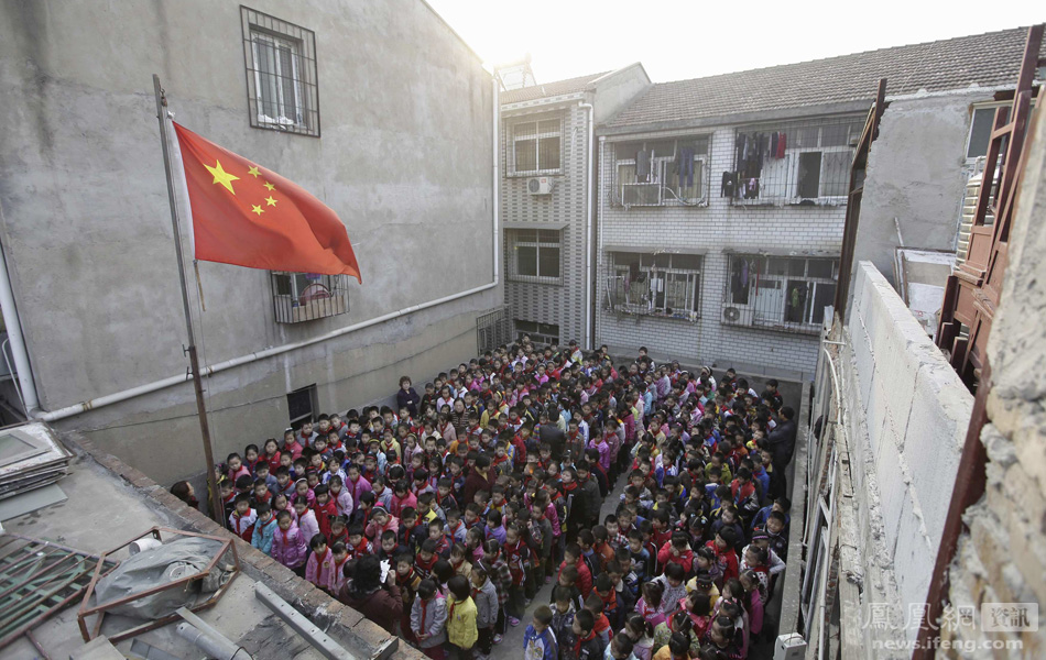 11月14日,武汉灵智小学的师生在居民楼屋顶上举行升旗仪式,因为空间十分狭小,孩子们挤成一团。