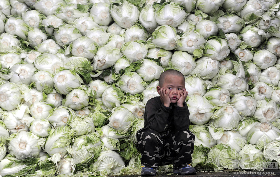 浙江嘉兴某农贸市场内,一个小男孩蹲在一堆大白菜旁。