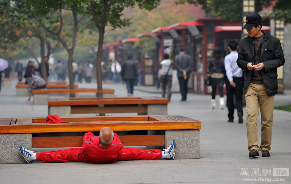 西安,在大雁塔下,一位老人做出各种让人惊叹的动作,引来路人注目。老人叫任尚林,已经78岁高龄了。老人说他练的是柔功,许多动作年轻人作起来都有困难,他却很轻松。