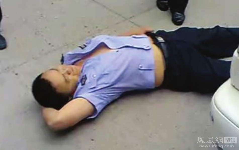 11月5日,微博上出现一个标题为“警察被商户轻推假摔被戏称‘假摔帝’”的视频,在这段时长1分钟的视频中,蒲江县一名男子和警察发生争执,用右手推警察,警察被推后仰身倒在地上40多秒,并喊头疼。该视频在网上很快传开,网友纷纷跟帖评论,并引发了“警察假摔”和“男子袭警”的两种截然不同的争论。图为被指为“假摔”的警察躺倒在地。