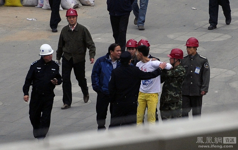 11月4日中午,北京,一位年轻人在没有任何保护措施的情况下徒手攀爬央视配楼,被工地上的工人发现并把他架下来,随后警察将其带走。图为工人将白衣男子转交给警察。