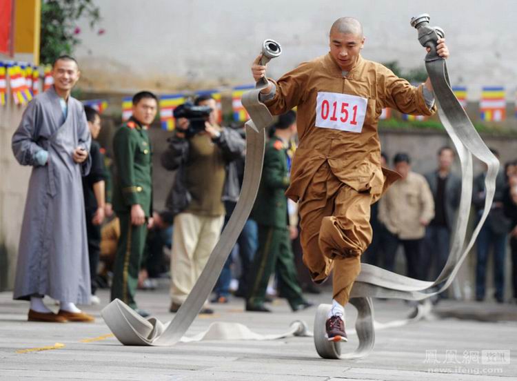 11月4日,杭州市宗教界在灵隐寺举行首届消防运动会。来自灵隐寺、永福寺、灵顺寺、韬光寺、抱朴道院、福星观等12家宗教单位近70余名运动员分别参加百米负重跑、二人百米接力操、着装救人出水操等5个项目比赛。平日里身穿袈裟道袍的僧人道士,端起水枪、甩起水带,也颇有架势。图为一位僧人正在参加二人百米接力比赛。