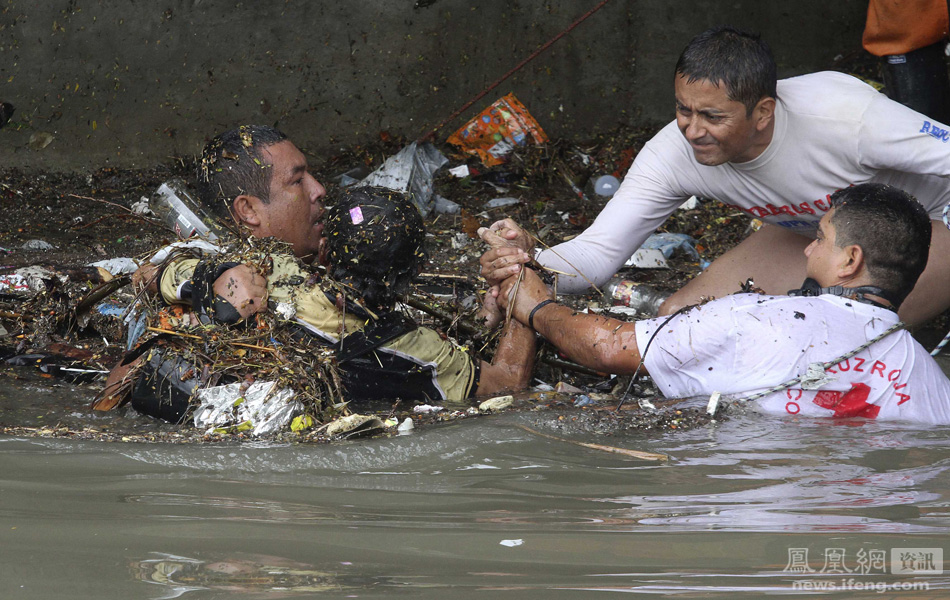 当地时间11月8日,哥伦比亚卡利,救援人员营救困在洪水中的男子。近日的强降雨导致哥伦比亚十个省份遭受洪水袭击,已造成120人死亡。