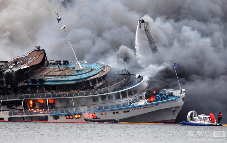 当地时间11月14日,俄罗斯莫斯科的一个码头,救援人员正在扑救起火的谢尔盖·阿布拉莫夫(Sergei Abramov)号轮船。暂无人员伤亡报告。