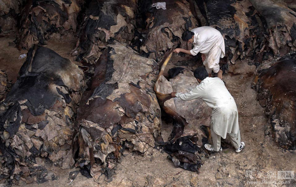 当地时间11月9日,巴基斯坦拉合尔,男人们正在清点将被卖给皮具作坊的母牛皮。