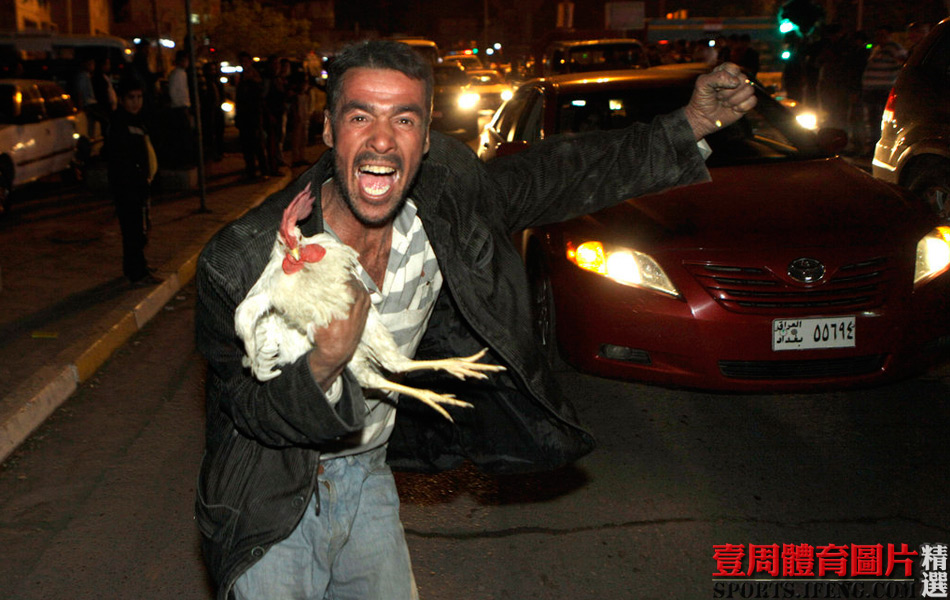 2011年11月16日,伊拉克,2014世界杯亚洲区预选赛,伊拉克客场3-1战胜约旦,携手晋级十强赛,本土球迷欢呼雀跃。图为一名伊拉克球迷抱起自家的公鸡兴奋的呐喊。