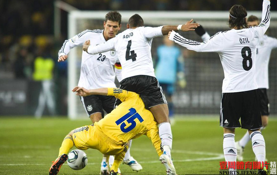 当地时间2011年11月11日,足球友谊赛,德国3-3乌克兰。奥戈在防守中骑上了对方脖子。