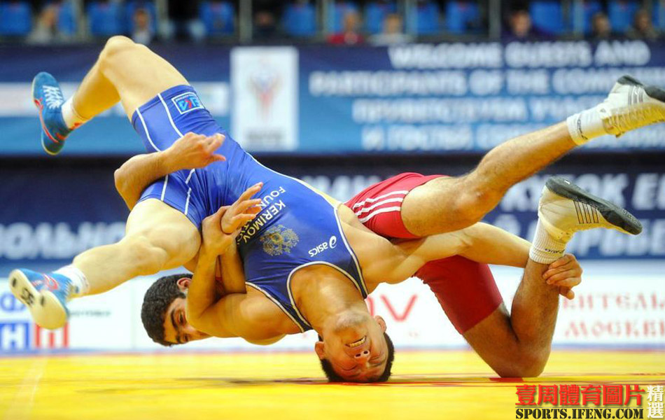 当地时间2011年11月13日,欧洲国家杯自由式摔跤60公斤级决赛,两国选手激烈争夺。
