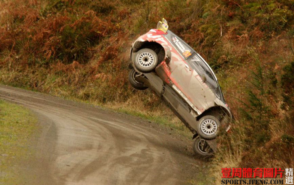 当地时间2011年11月11日,2011年世界拉力锦标赛英国站第2日,布劳克布驾驶的赛车翻出赛道。