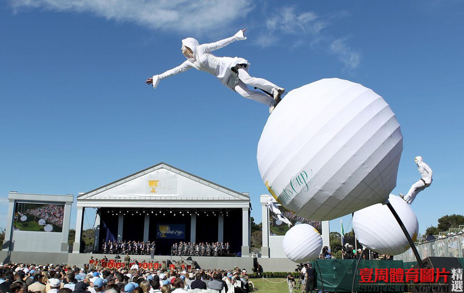 2011年11月16日,澳大利亚墨尔本,2011总统杯高尔夫球对抗赛开幕式盛况。图为真人扮演的高尔夫造型。