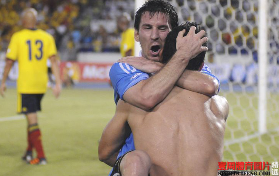 2011年11月15日,哥伦比亚巴兰基亚,2014世界杯南美区预选赛,阿根廷2-1哥伦比亚。图为梅西兴奋的抱住队友。