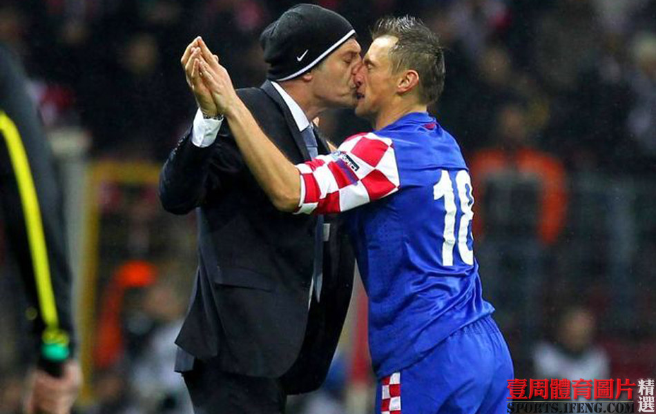 当地时间2011年11月11日,2012年欧洲杯预选赛附加赛,土耳其3-0克罗地亚。奥利奇与主帅比利奇上演激情一吻