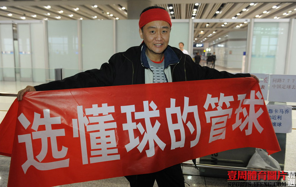 2011年11月16日,中国北京,中国国家男子足球队在结束了2014世界杯预选赛亚洲区客场比赛后,抵达首都国际机场。痴心球迷带着标语在机场苦苦等待。