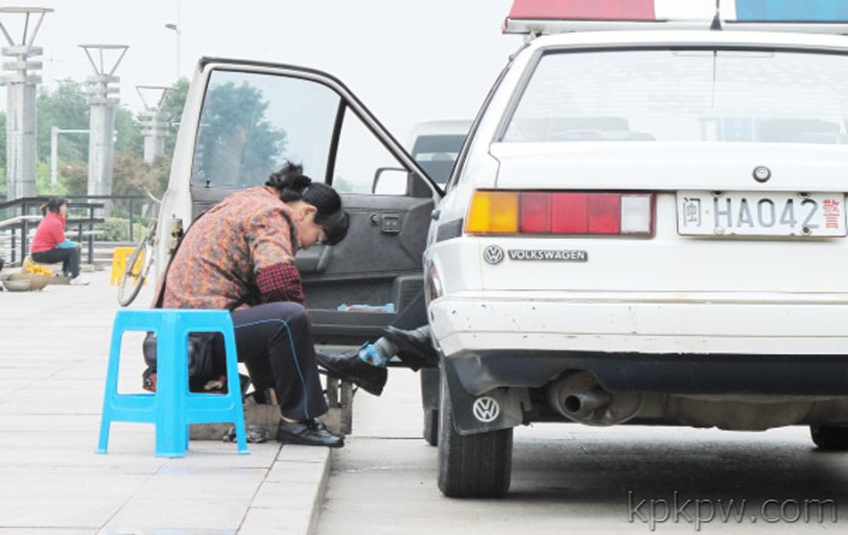 11月8日,网友“冰山一粟”在其网络相册上传名为“给俺擦鞋”的照片。该经由“快拍快拍网”微博转发后,在微博引起热烈反响。图为11月7日, 一辆福建牌照的警车停在浙江衢州火车站广场上, 车内伸出一只脚,擦鞋阿姨正在为其“服务”。
