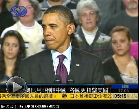 奥巴马:“他们在亚洲做了一项民调,‘与中国比较,你们怎么看待美国’,九个国家有八个都说美国是他们所指望的国家。”