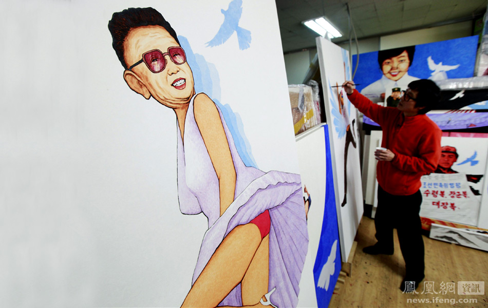 “脱北者”艺术家Song Byeok在韩国首尔举办艺术展,其中一幅作品将朝鲜领导人金正日的面孔与性感女神玛丽莲·梦露的身体搭配在一起。