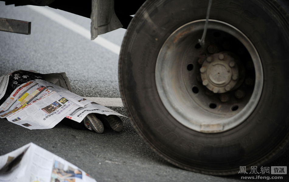 广东深圳梅坂大道家和花园路段,3岁男童小伟被突如其来的10轮大货车压在车轮下面,在慌忙伸手拉孩子的瞬间,母亲也被前轮轧断脚趾。图为小伟的遗体用报纸覆盖,停放在肇事的货车下。