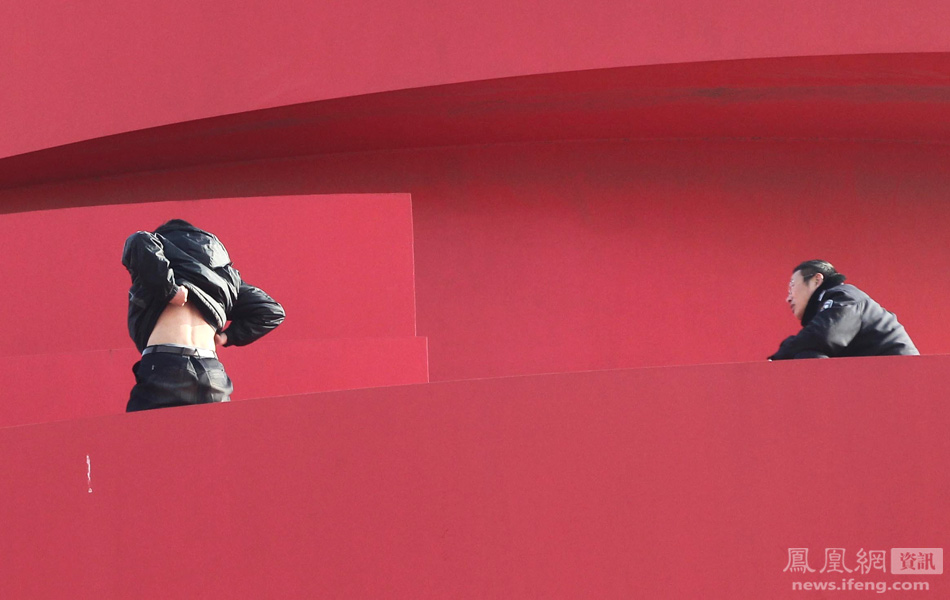 12月25日下午,青岛,一位姓宋的中年男子攀爬到青岛的标志性雕塑——“五月的风”顶端企图自杀,目击者称,宋姓男子的妻子随后赶到现场,但拒绝对丈夫进行劝说施救。图为民警试图与自杀者宋某对话。