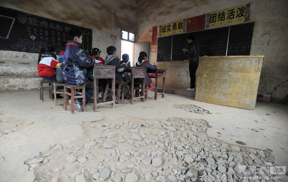 阴暗的教室里,没有电灯,一阵寒风吹过,风透入屋里,卷起阵阵灰尘。江西省九江市星子县蛟塘镇新宁小学,102名学生就在这样的校舍里上课。图为新宁小学建在一栋60年代的建筑里面,由于经费短缺,年久失修,教室地面损坏严重。