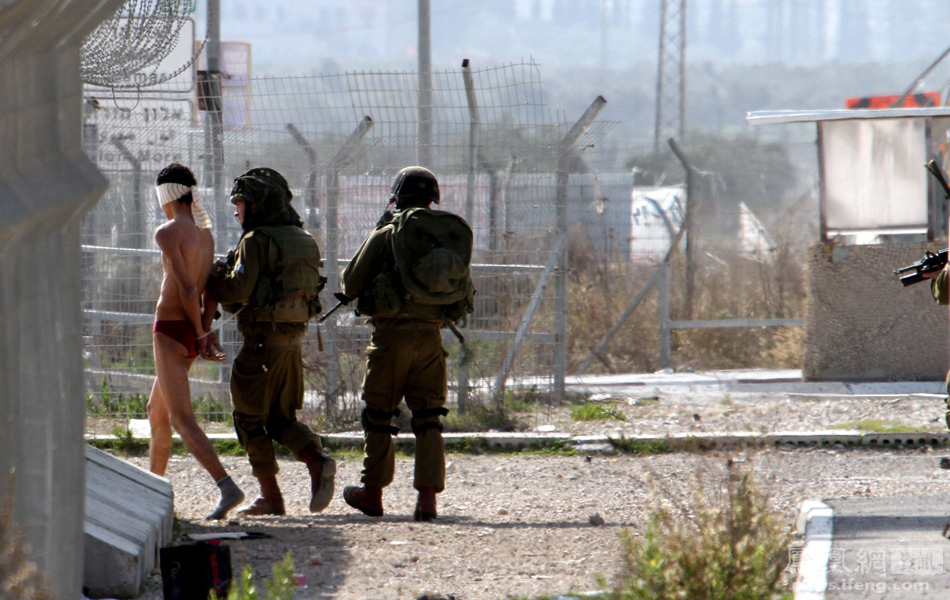 在约旦河西岸城市纳布卢斯附近的哈瓦拉(Hawara)检查站,以色列士兵逮捕一名巴勒斯坦年轻人。
