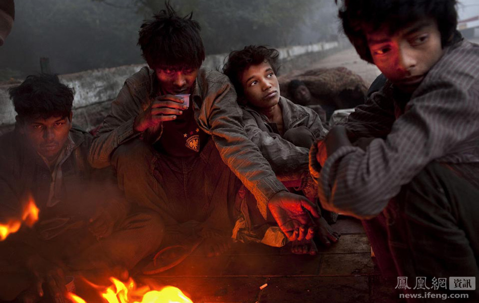 印度新德里,无家可归的年轻人围在火堆边取暖。12月和1月有几个星期当地气温会急剧下降,最受煎熬的是穷人。