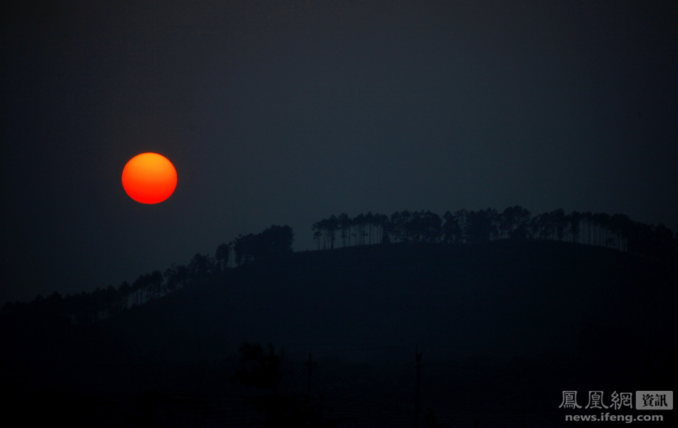 广东陆丰乌坎村,小山上空的落日。