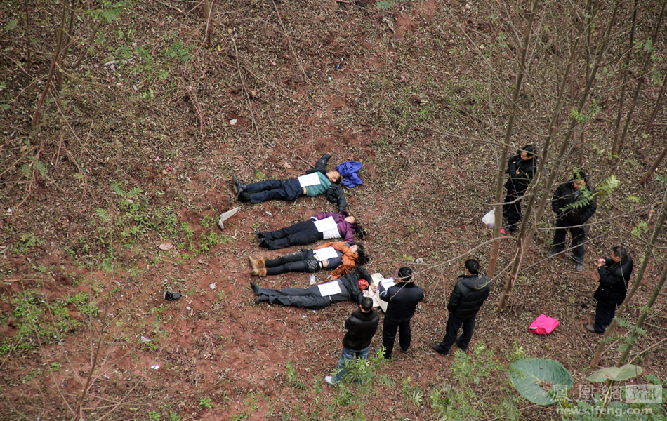1月9日,重庆巫山,官渡场镇居民龚元文驾驶皮卡车从官渡镇前往县城探亲,途经巫峡镇白杨溪沟大桥时翻入桥下,造成4死1伤的交通事故。图为遇难者遗体。