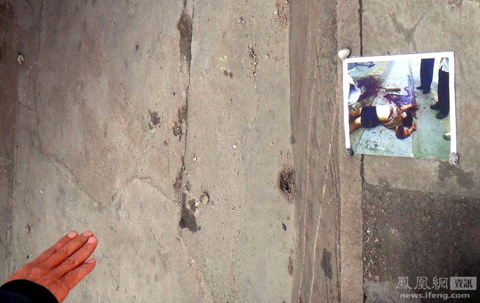 1月9日,广东惠州小金口供销社的墙上张贴着游瑞红遇害现场的照片。去年10月9日,前去农资店买老鼠药的农妇游瑞红被供销社老板林德标八斧劈下一只胳膊后身亡。目前,凶手林德标在案逃离,公安高额悬赏追凶。有目击者称看到凶手杀人后骑着摩托车满身都是血逃离现场。